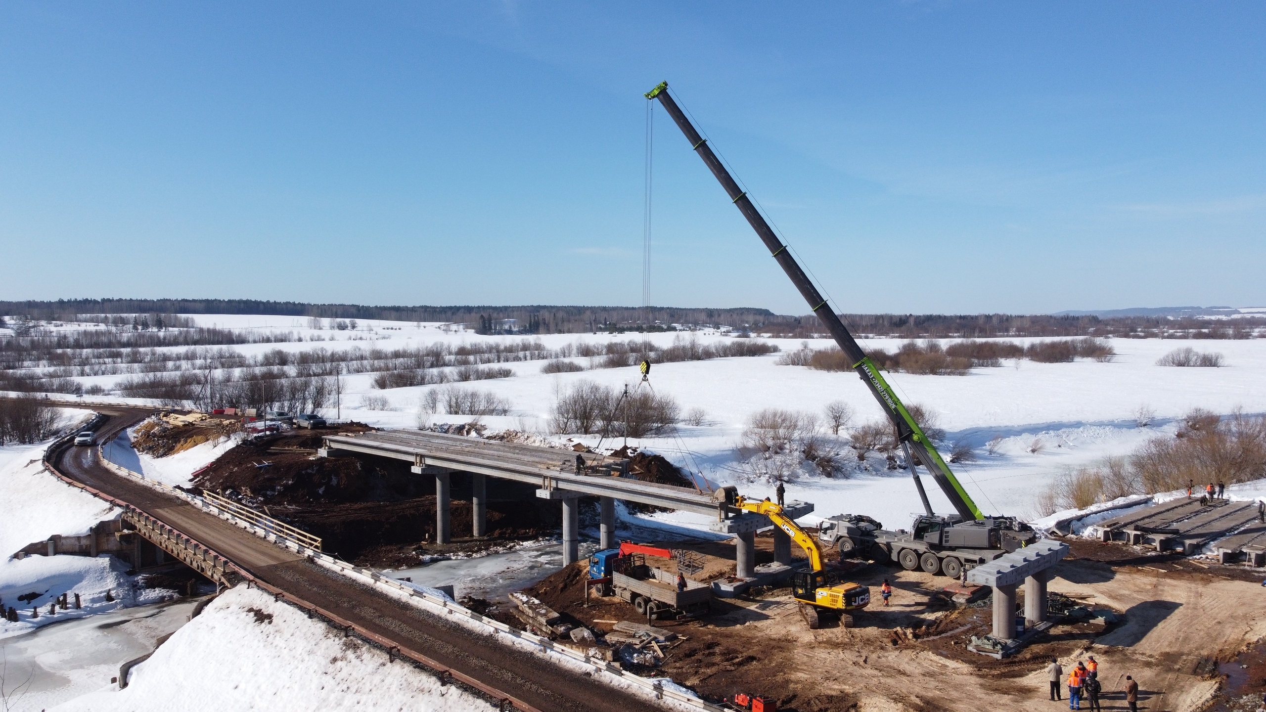 - Добрый день. В этом году благоустройство территории Юсьвинского муниципального округа проводится в рамках сразу нескольких важных проектов. Один из самых крупных проектов - Ремонт моста через реку Иньва на автодороге Юсьва — Архангельское, который проводится в рамках национального проекта "Инфраструктура для жизни". Ремонт моста начался осенью 2025 года и продолжается в любых погодных условиях. На начальном этапе подрядная организация выполнила демонтаж старого моста, который уже исчерпал свой ресурс эксплуатации и нуждался в замене, построила временный объездной мост для бесперебойного транспортного сообщения. После завершения подготовительных работ начался монтаж новых конструкций моста. Подрядная организация устанавливает новые элементы конструкций моста. По состоянию на текущую дату реконструкция моста выполнена на 31% от общего объема предусмотренных работ. Ремонт ведется с небольшим опережением графика. Подрядная организация планирует завершить установку опор моста и укладку перекрытий до наступления весенних паводков. Завершение ремонта моста планируется осенью 2026 года.