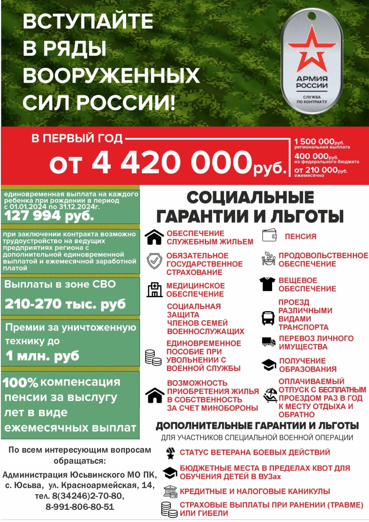 По вопросам поступления на военную службу по контракту могут также обращаться в администрацию Юсьвинского муниципального округа:с. Юсьва, ул. Красноармейская, 14, телефоны: 89918068051, (834246) 2-71-05.