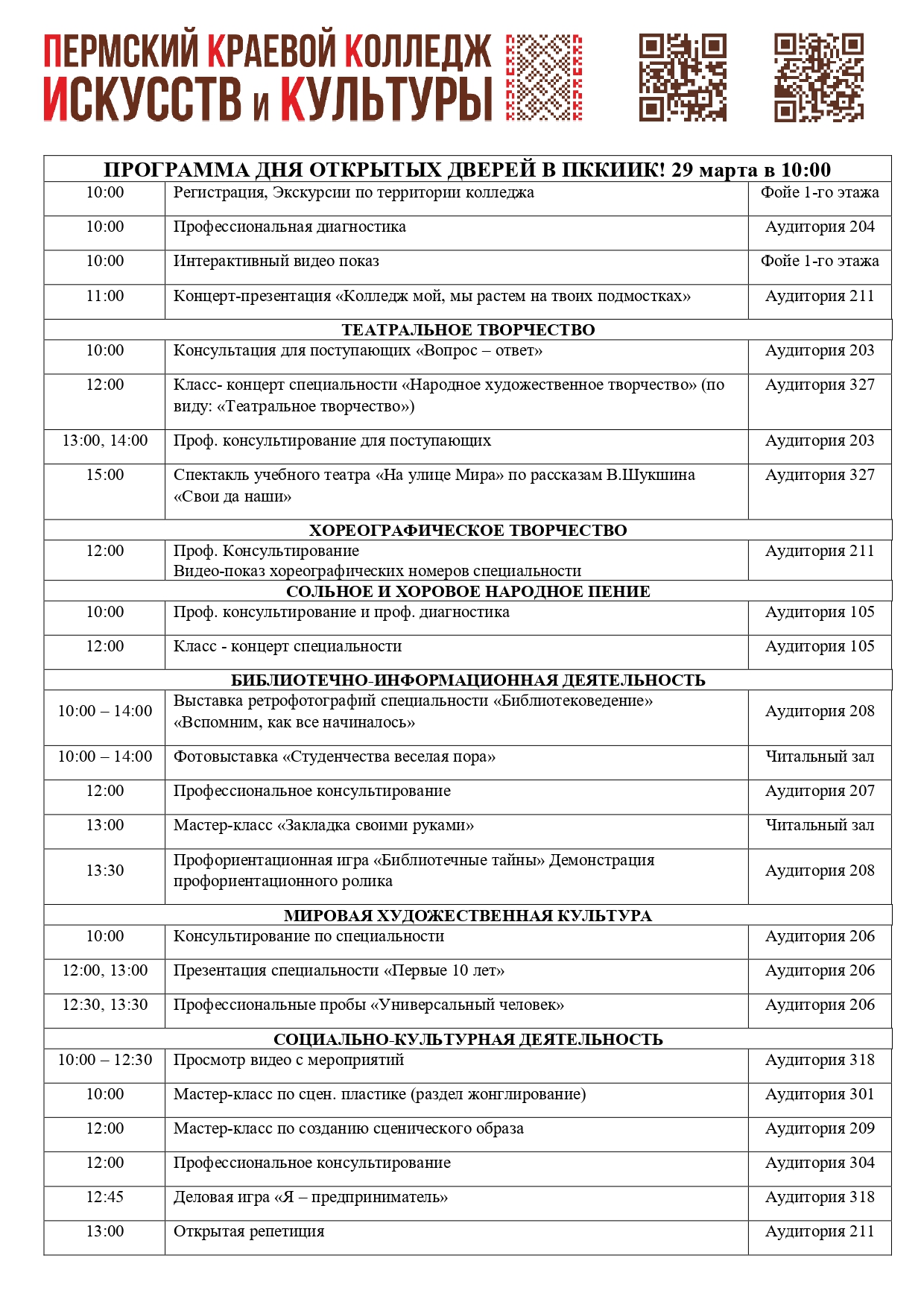 ГБПОУ «Пермский краевой колледж искусств и культуры» приглашает выпускников школ, средних профессиональных образовательных учреждений и всех заинтересованных лиц на День открытых дверей, который состоится 29 марта (суббота)!