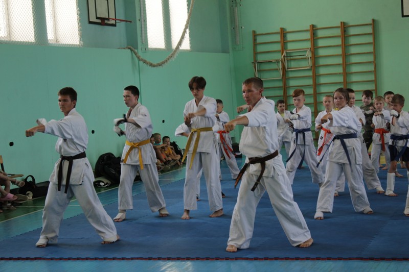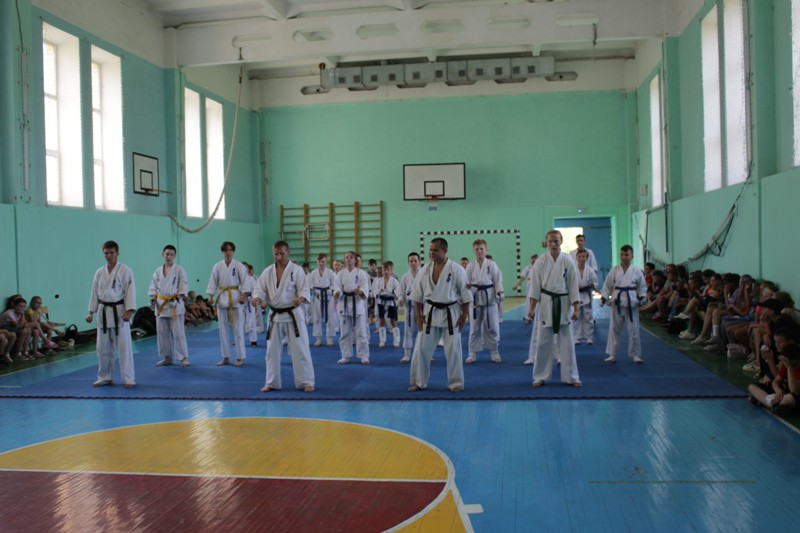 На следующем этапе прошли показательные выступления воспитанников местного спортивного клуба киокусинкай-каратэ под руководством тренера Дмитрия Носкова- представителя Общественного совета при территориальном отделе полиции.