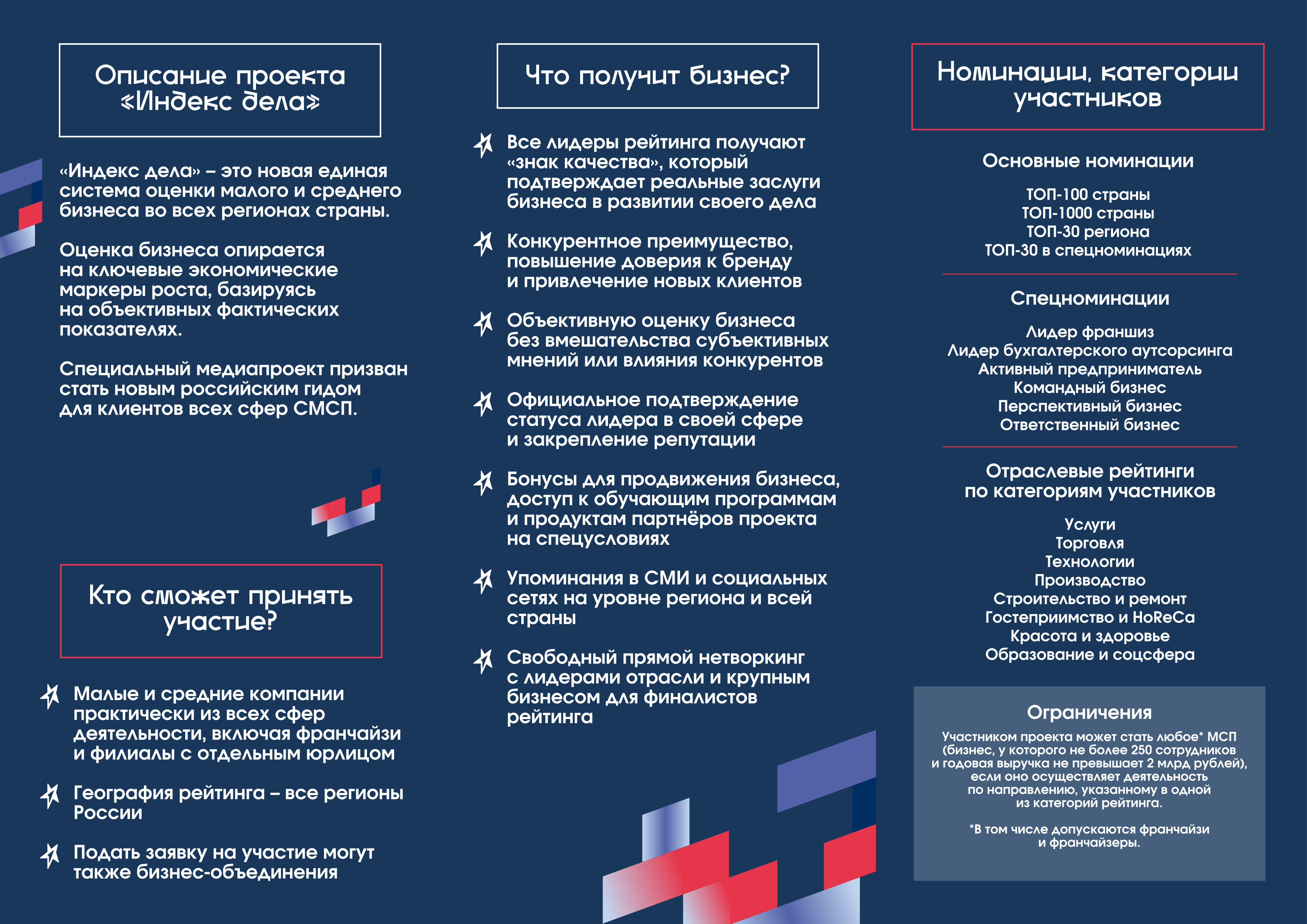 Предприниматели со всей страны, практически из всех сфер деятельности, включая франчайзи и филиалы с отдельным юрлицом, а также бизнес-сообщества, смогут принять участие во Всероссийском рейтинге «Индекс дела».