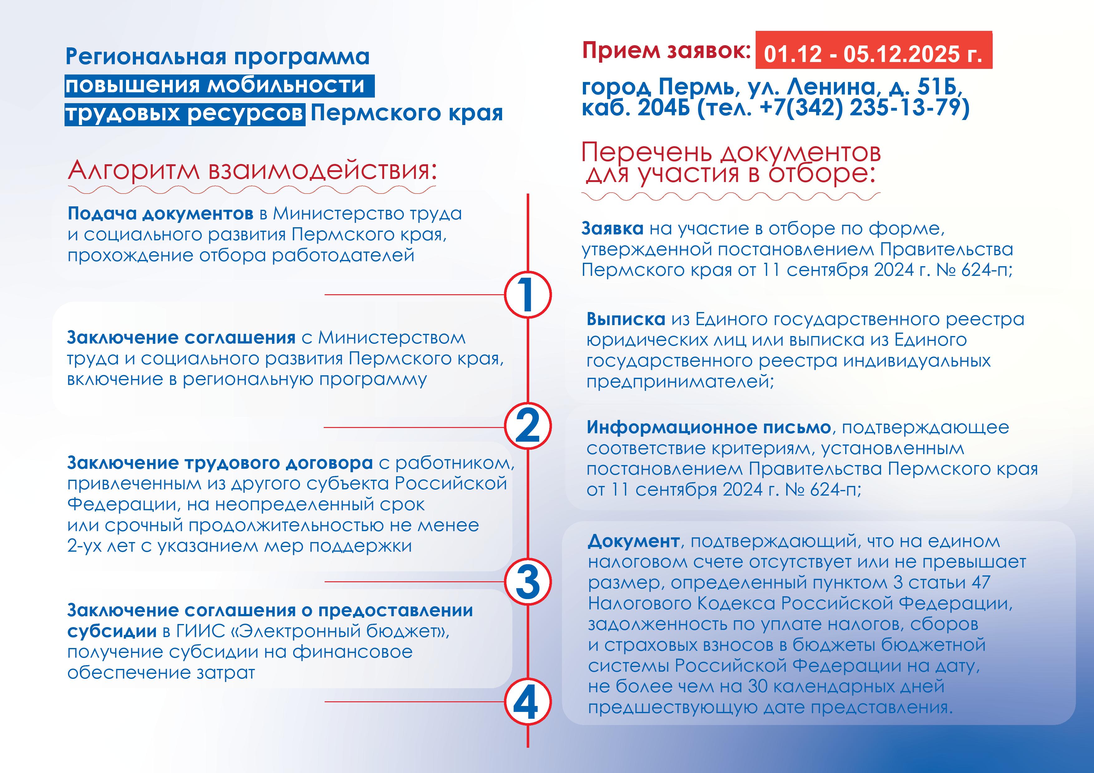 Объявлен дополнительный отбор работодателей для участия в региональной программе. Для участия работодателям необходимо в соответствии с Порядком и критериями отбора работодателей предоставить в Министерство в период с 01 декабря по 05 декабря 2025 года по адресу: г. Пермь, ул. Ленина, д. 51б, каб. 204Б (вход со стороны улицы Петропавловской) следующие документы: