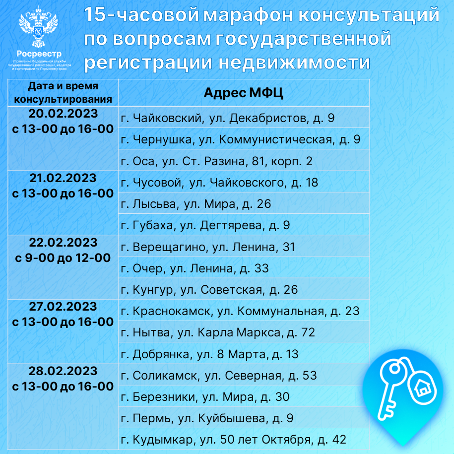 Управление Росреестра по Пермскому краю в рамках 15-летия ведомства проводит 15-часовой марафон консультаций для получателей услуг Росреестра по вопросам государственной регистрации недвижимости.