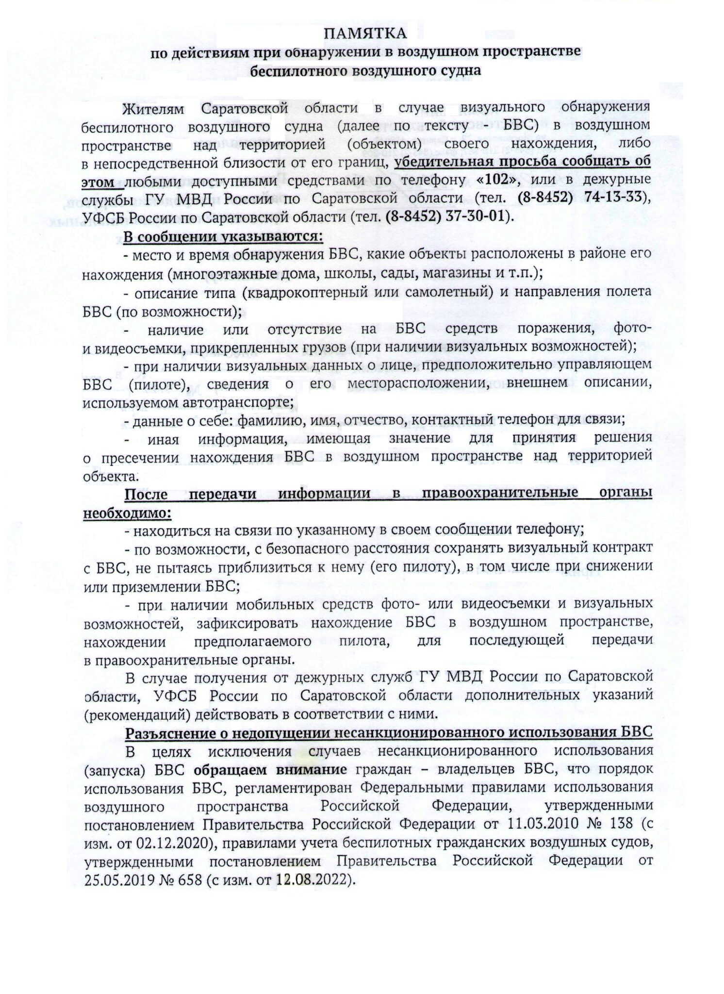 Действия при обнаружении беспилотника